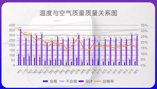 室内空气质量与环境温度相关,从合格率跟环境温度的趋势图可以看出,合格率跟温度升高呈现负相关性趋势。