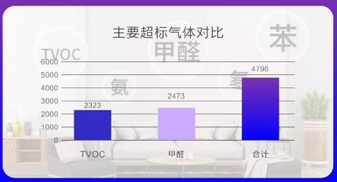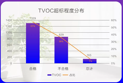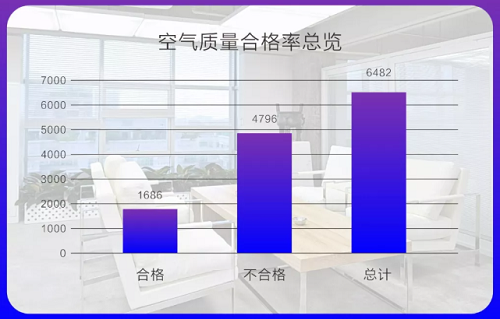 室内空气污染的主要有害气体是甲醛和TVOC(总挥发性有机物),在6482个检测样本中,这2种气体超标点位共计4796个,占总不合格点位的97.3%。