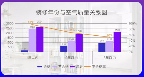 室内空气污染程度随着装修完成年份的增长而降低,其中装修1年内房屋不合格率为95%,装修2年内不合格率为65%,装修3年内不合格率为55%。