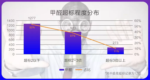 甲醛超标2倍以下的点位占比52%,超标2-3倍的点位占比37%,超标3倍以上的点位占比11%,其中最高超标记录为超过国家标准12倍。