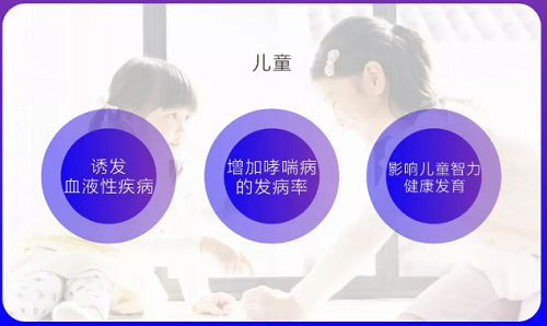 儿童的身体正在发育中,免疫系统比较脆弱,另外儿童呼吸量按体重比比成年人高50%,这就使他们更容易受到室内空气污染的危害。室内空气污染会诱发儿童的血液性疾病、增加儿童哮喘病的发病率、影响儿童的身高和智力健康发育。全球因空气污染导致的急性呼吸系统感染,每年夺去大约400万名儿童的生命。