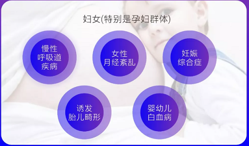 女性脂肪多,苯吸收后易在脂肪内贮存,长期暴露在高浓度污染物的环境中,会导致月经紊乱,孕妇可引发妊娠综合症、胎儿畸形等。