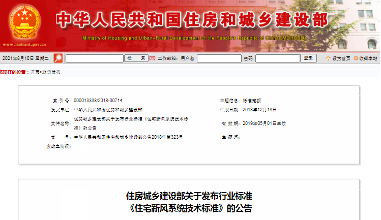 住房城乡建设部为统一住宅新风系统工程技术要求,保证工程质量,改善住宅的室内空气质量,制定行业标准《住宅新风系统技术标准》。