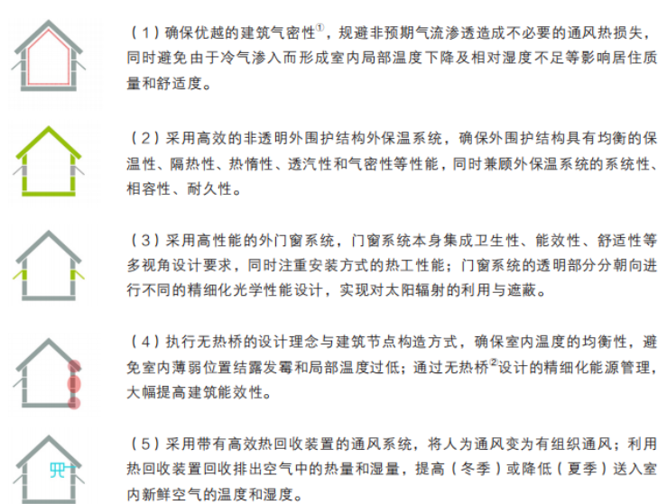形成高效的外围护结构外保温系统、高性能的被动式外门窗系统、建筑气密性n 50≤0.6h-1、无热桥的节点构造、高效热回收通风系统的规范化设计建造方法。