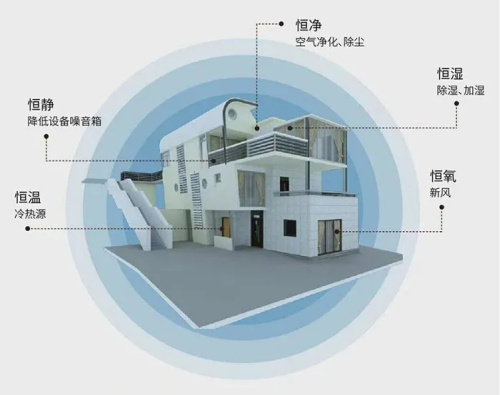其实,五恒系统并没有听上去那么高大上,其实它就是将原有的冷热源、末端系统、除湿加湿系统、新风系统进行有效整合而成,用于解决室内冷热、含氧量、干湿和空气洁净等问题。