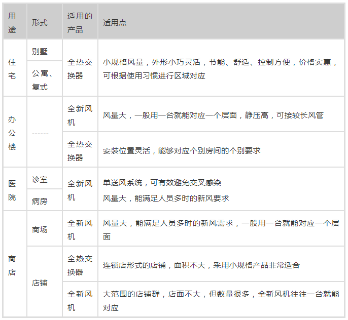 从上表中可以看到,两种新风产品在工作原理和系统结构上都有区别,因此,对应不同的项目,全新风机和全热交换器也有各自不同的适应性,下表列举了部分不同用途的建筑全新风机和全热交换器的适应性:
