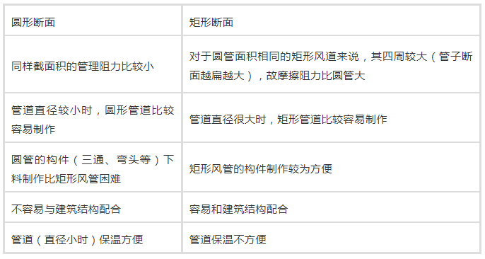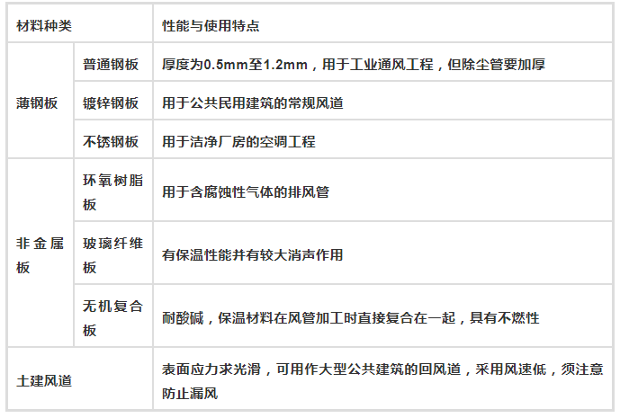 风管是空调及通风系统中常见的部件,风管材料从总体上可以分为薄钢板和非金属板以及土建风道,其材料种类以及性能使用特点见下表,在一般工程中多采用钢板形式,其优点是不燃烧、易加工、耐久,也比较经济。