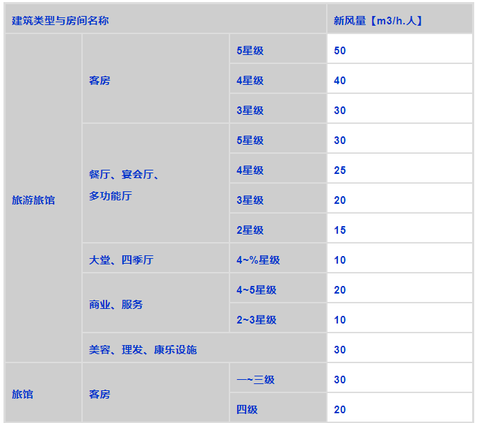 在确定了房间功能后,可根据相关的设计标准或者节能标准中的新风量指标选择相应的数据,目前,新风量的最低指标一般都取30m3/h.人,但若要根据房间功能切实的确定新风量,则参见下表: