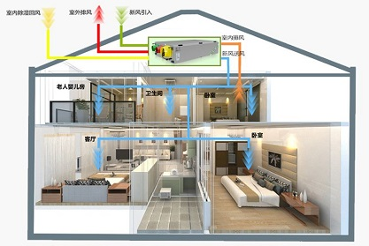 新风除湿系统是将新风和除湿组合在一起,以新风除湿主机通过管路到达室内的各个房间,根据不同需求对各个房间进行除湿和通风换气。