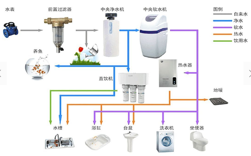 家用净水系统主要分为生活用水及饮用水,生活用水主要用于洗衣、洗澡、冲马桶、打扫卫生、洗手、洗脸、洗菜、淘米等水, 占了家庭用水的95%-98%。饮用水主要是烧饭、烧汤及喝的水占 2-5%。中央净水系统设备目前有如下功能性产品:(1)前置过滤器;(2)净水机;(3)软水机;(4)末端直饮机。