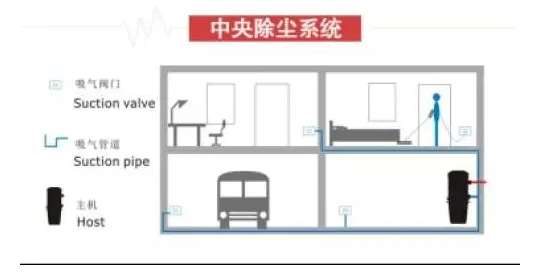 中央吸尘系统由吸尘器主机、吸尘管道、吸尘插口、吸尘组件组成。吸尘主机置于室外或建筑物的机房、阳台、车库、设备间内,主机通过嵌至墙里的吸尘管道与每个房间的吸尘插口相连接,连接在墙外只留如普通电源插座大小的吸尘插口,在进行清洁工作时将一根较长的软管插入吸尘插口,将灰尘、纸屑、烟头、螨虫、杂物及有害气体通过严格密封真空管道,把灰尘吸到吸尘器主机的垃圾袋中。