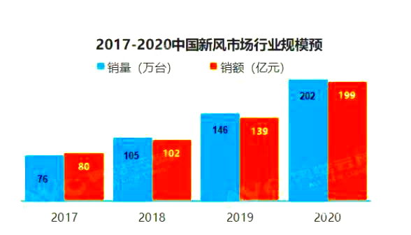 根据相关机构研究分析从销量上来看,2017-2020年我国新风系统分别销售了76、105、146万台、202万台,复合增长率超30%.预计2021年我国新风系统销量会高于2020年的增长率。