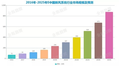 数据显示,2018年,中国新风系统销售额首次突破百亿元人民币,达到120亿元左右,2019年中国新风系统行业市场规模达到165亿元,同比增长37.5%。而2020年受新型冠状病毒的外力推动,预计全年新风系统市场规模达到236亿元。2021-2025年,若按照30%的年均复合增长率,则2025年新风系统行业市场规模将达到877亿元,市场空间巨大。